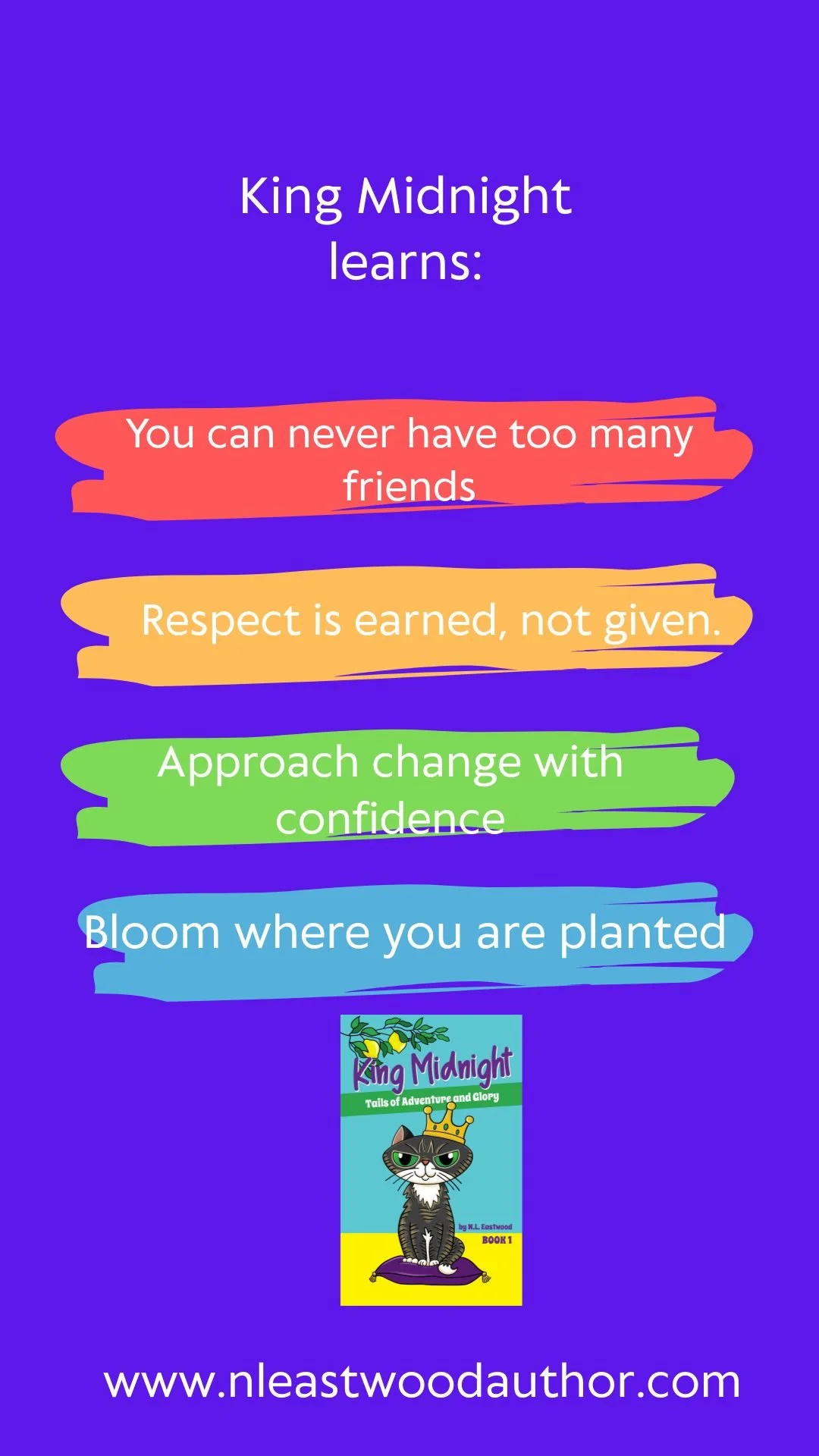 Throughout the book, King Midnight:Tails of Adventure and Glory, Midnight learns many life lessons. He shares these lessons in his Royal Remarks, found at the end of each chapter.